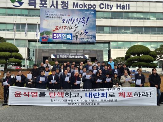 전남 목포지역 정당과 시민사회단체가 참여한 ‘목포시민 비상 시국회의’는 4일 오전 목포시청 앞에서 기자회견을 열고 “윤석열 대통령을 탄핵하고 내란죄로 체포하라”고 촉구했다.