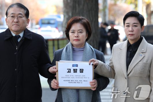(서울=뉴스1) 신웅수 기자 = 정춘생 의원을 비롯한 조국혁신당 의원들이 4일 오후 서울 서대문구 경찰청 국가수사본부에 윤석열 대통령 등에 대한 고발장을 제출하고 있다. 조국혁신당은 윤 대통령과 김용현 국방부 장관, 이상민 행정안전부 장관, 박안수 육군참모총장을 내란죄와 반란죄 혐의로 고발했다. 2024.12.4/뉴스1