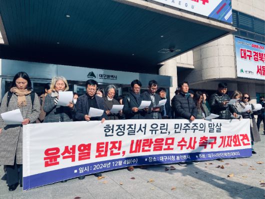 대구시민단체연대회의는 4일 오후 대구시청 동인청사 앞에서 긴급 기자회견을 열고 "윤석열 대통령은 하야하고, 사법당국은 윤 대통령의 내란 음모에 대해 수사하라"고 밝혔다.