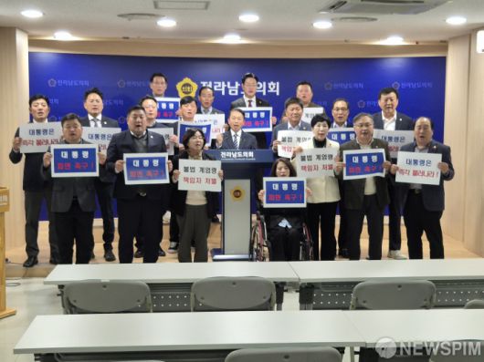 [광주·무안=뉴스핌] 조은정 기자 = 광주시의회와 전남도의회가 4일 전남도의회 브리핑룸에서 윤석열 대통령 긴급 담화·계엄 관련 긴급 기자회견을 하고 있다. 2024.12.03 ej7648@newspim.com