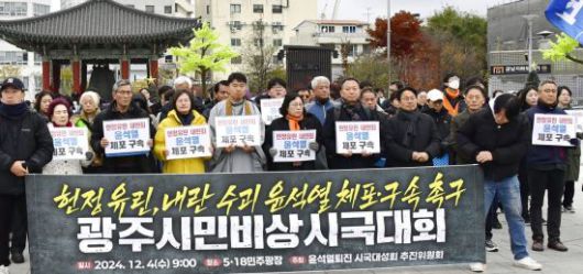 윤석열 퇴진 시국대성회 추진위원회는 4일 오전 광주 동구 5·18민주광장에서 ‘광주시민 비상시국대회’를 열고 윤석열 대통령을 즉각 체포와 함께 탄핵 추진을 촉구했다. 시국대회에는 시민사회단체와 노동계, 정치계, 종교계, 시민 등 400여명이 참여했다.