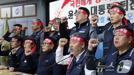 (서울=뉴스1) 장수영 기자 = 김동명 한국노총 위원장 등 지도부가 4일 오후 서울 여의도 한국노총 대회의실에서 열린 윤석열 대통령 퇴진 촉구 기자회견에서 규탄 구호를 외치고 있다. 한국노총은 윤 대통령을 대통령으로 인정할 수 없으므로 정부를 사회적 대화 상대로 인정하지 않겠다고 밝혔다. 2024.12.4/뉴스1