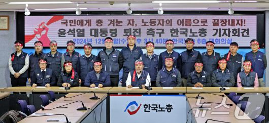(서울=뉴스1) 장수영 기자 = 김동명 한국노총 위원장 등 지도부가 4일 오후 서울 여의도 한국노총 대회의실에서 열린 윤석열 대통령 퇴진 촉구 기자회견에서 규탄 구호를 외치고 있다. 한국노총은 윤 대통령을 대통령으로 인정할 수 없으므로 정부를 사회적 대화 상대로 인정하지 않겠다고 밝혔다. 2024.12.4/뉴스1