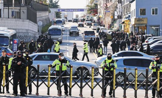 윤석열 대통령이 비상계엄 해제를 선언한 4일 서울 용산구 대통령실 입구가 경찰에 의해 통제되고 있다. 뉴스1 |