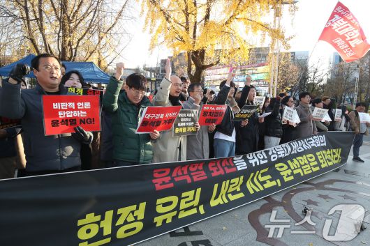 (대구=뉴스1) 공정식 기자 = 경북대 교수와 학생 등으로 구성된 '윤석열 퇴진을 위한 경북대학교 비상시국회의'는 4일 오후 대구 북구 경북대 북문 앞에서 출범식을 열고 전날 밤 비상계엄을 선포했던 윤 대통령 퇴진을 촉구하고 있다. 2024.12.4/뉴스1jsgong@news1.krCopyright ⓒ 뉴스1. All rights reserved. 무단 전재 및 재배포, AI학습 이용 금지.