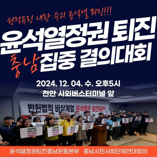 윤석열정권퇴진충남운동본부와 충남시민사회단체연대회의는 4일 오후 5시 천안 시외버스터미널 앞에서 ‘헌정유린 내란 수괴 윤석열 정권 퇴진 충남 집중 결의대회’를 개최한다.