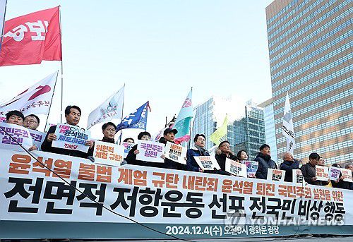 (서울=연합뉴스) 김은경 기자 = 노동계가 윤석열 대통령의 비상계엄 선포·해제 사태 이후 한목소리로 윤석열 정권의 퇴진을 요구하면서 파업·대화 거부 등의 방법으로 투쟁을 전개하겠다는 입장을 밝혔다.