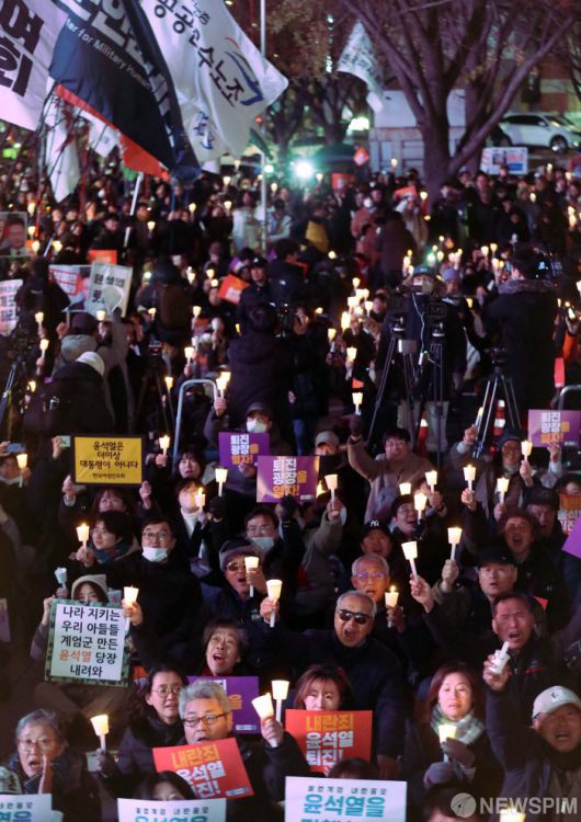 [서울=뉴스핌] 최지환 기자 = 4일 오후 서울 종로구 동화면세점 앞에서 시민들이 윤석열 대통령의 퇴진을 촉구하는 촛불집회를 열고 있다. 2024.12.04 choipix16@newspim.com