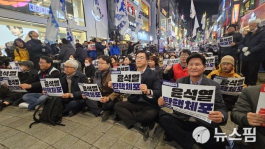[부산=뉴스핌] 남동현 기자 = 4일 오후 7시 부산진구 서면에서 열린 '군사반란 계엄 폭거 내란범죄자 윤석열 즉각 퇴진 부산시민대회'에서 참석자들이 '내란범죄자 윤석열 탄핵체포'라고 적은 손푯말을 들고 있다.ndh4000@newspim.com 저작권자(c) 글로벌리더의 지름길 종합뉴스통신사 뉴스핌(Newspim), 무단 전재-재배포 금지