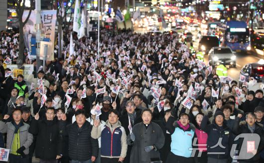 (대전=뉴스1) 김기태 기자 = 윤석열퇴진대전운동본부와 시민단체를 비롯해 시민들이 4일 대전 서구 은하수네거리에서 윤석열 대통령 퇴진을 촉구하는 집회를 열고 있다. 2024.12.4/뉴스1