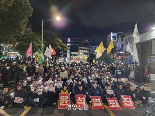 이들은 이날 시청 앞에서의 집회에 이어 제주시청 인근 도로를 행진하면서 “윤석열은 퇴진하라”는 구호를 외쳤다. 이번 윤 대통령 퇴진 촉구 집회는 당분간 매일 열릴 예정이다.