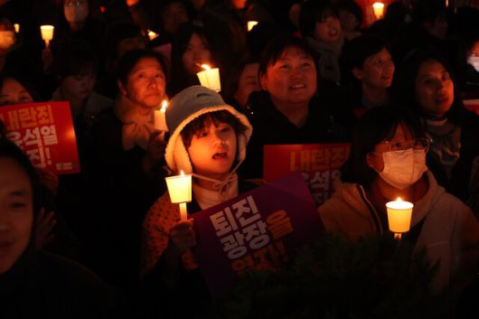 민주사회를 위한 변호사모임과 참여연대 등 시민단체와 민주노총이 4일 저녁 서울 종로구 동화면세점 앞에서 연 ‘내란죄 윤석열 퇴진! 국민주권 실현! 사회 대개혁! 퇴진광장을 열자! 시민 촛불’ 집회에서 시민들이 촛불을 들고 윤석열 대통령 퇴진과 내란죄 체포 등을 촉구하고 있다. 정용일 선임기자 yongil@hani.co.kr |