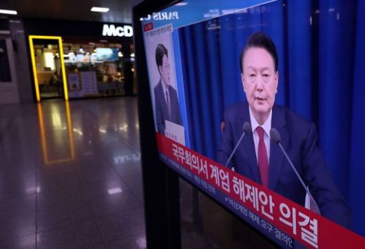 윤석열 대통령이 4일 새벽 4시30분 긴급 담화를 통해 어젯밤 선포된 비상계엄을 국회의 요구를 수용해 해제한다고 밝혔다. 사진은 윤대통령 긴급 담화가 서울역 대합실 TV에 나오고 있다. 조용준 기자 |