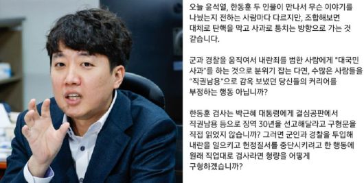 이준석 의원은 4일 자신의SNS를 통해 “군과 경찰을 움직여 내란죄를 범한 사람에게 ‘대국민 사과’를 하는 것으로 분위기를 잡는다면, 수많은 사람들을 ‘직권 남용’으로 감옥 보냈던 당신들의 커리어를 부정하는 행동 아닌가”라고 직격했다.