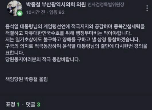 [이데일리 채나연 기자] 윤석열 대통령의 비상계엄 선포에 대한 결정을 적극 지지한다는 글을 올려 논란을 빚은 국민의힘 소속 박종철 부산시의회 의원(기장1)이 사과 뜻을 나타냈다.