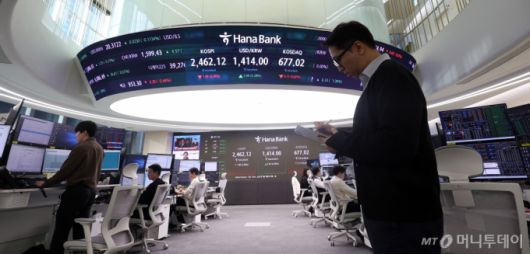 [서울=뉴시스] 홍효식 기자 = 코스피가 전 거래일(2464.00)보다 7.45포인트(0.30%) 상승한 2471.45에 개장한 5일 오전 서울 중구 하나은행 딜링룸 전광판에 지수가 표시되고 있다. 코스닥 지수는 전 거래일(677.15)보다 2.64포인트(0.39%) 오른 677.59, 서울 외환시장에서 원·달러 환율은 전 거래일 주간거래 종가(1410.1원)보다 2.3원 오른 1412.4원에 출발했다. 2024.12.05. yesphoto@newsis.com /사진=홍효식 |
