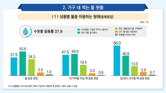 특히 집에서 차나 커피를 마실 때는 47.5%, 밥이나 음식을 조리할 때는 66%가 수돗물을 이용했다.