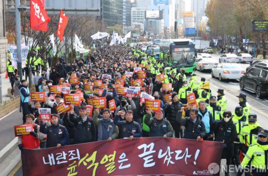 [서울=뉴스핌] 양윤모 기자 = 전국철도노조가 파업에 돌입한 5일 오후 서울역 앞에서 총파업 출정식을 진행하며 시청앞에서 마무리를 하고 있다. 2024.12.05 yym58@newspim.com |