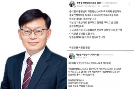 비상계엄 선언을 적극 지지한다는 취지의 글을 올렸다가 비판 세례를 받은 국민의힘 소속 박종철 부산시의원이 결국 사과했다. 그러나 박 시의원을 향한 비판은 사그라지지 않고 있다.