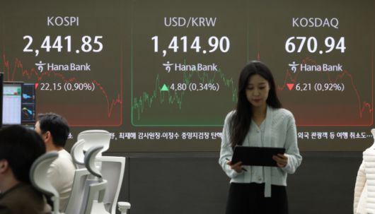 [서울=뉴시스] 황준선 기자 = 코스피가 전 거래일(2500.10)보다 22.15포인트(0.90%) 하락한 2441.85에 마감한 5일 오후 서울 중구 하나은행 딜링룸 전광판에 지수가 표시되고 있다. 코스닥 지수는 전 거래일(690.80)보다 6.21포인트(0.92%) 내린 670.94에 거래를 종료했다. 서울 외환시장에서 원·달러 환율은 전 거래일(1402.9원)보다 5.0원 뛴 1415.1원에 주간 거래를 마감했다. 2024.12.05. hwang@newsis.com /사진=황준선 |
