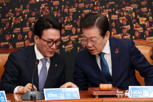 [서울=뉴시스] 조성우 기자 = 이재명(왼쪽) 더불어민주당 대표가 5일 오전 서울 여의도 국회에서 열린 비상 최고위원회의에서 김민석 최고위원과 대화하고 있다. 2024.12.05. xconfind@newsis.com |