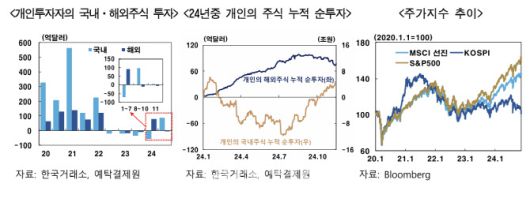 그러면서 한은은 향후 개인투자자의 주식투자 흐름은 국내 및 해외 증시 움직임에 영향받으며 높은 변동성을 나타낼 것으로 예상했다. 국내 증시뿐만 아니라 미 증시는 신정부의 정책변화 및 글로벌 AI 산업 업황 등의 불확실성에 영향받을 수 있기 때문이다. 한은은 “미 주가의 상승 기대가 확산되면서 개인투자자를 비롯한 거주자의 해외주식투자가 큰 폭 늘어날 경우 우리 외환 수급에 부담으로 작용할 수 있어 그 동향을 면밀히 지켜볼 필요가 있다”고 제언했다.