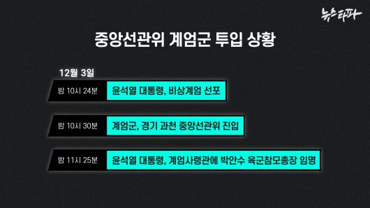 지난 3일 밤 윤석열 대통령의 비상계엄 선포 직후, 국회뿐만 아니라 중앙선관위에도 계엄군이 진입한 사실이 뉴스타파 보도로 확인된 가운데, 계엄사령관 임명되기 이전에 제3공수특전여단이 중앙선관위에 먼저 투입된 사실이 추가로 드러났다.