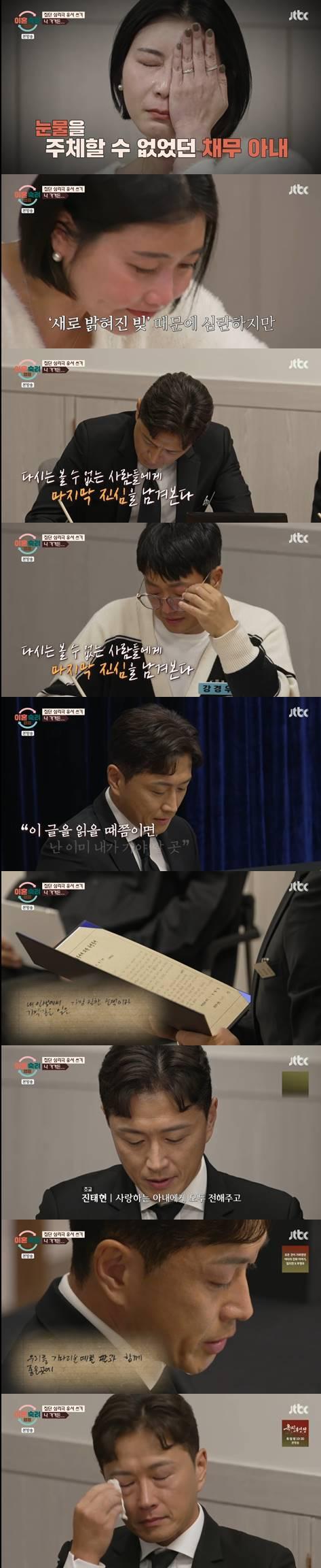 5일 방송된 JTBC 예능 프로그램 '이혼숙려캠프'에서는 출연 부부들과 함께 MC 진태현, 박하선이 유서를 쓰고 읽는 시간을 가졌다.