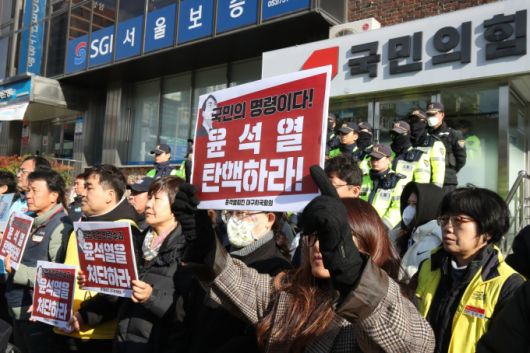 윤석열퇴진대구시국회의는 5일 오후 대구 수성구 국민의힘 대구시당 앞에서 '윤석열 탄핵 촉구' 기자회견을 열고, 국민의힘이 윤 대통령 탄핵에 동참할 것을 촉구하고 있다./사진=뉴스1 |