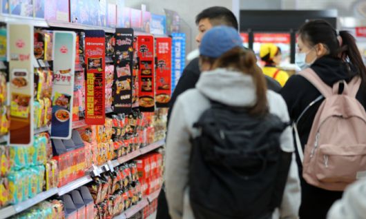 [서울=뉴시스] 김혜진 기자 = 라면, 과자, 쌀가공식품 등 수출이 호조세를 보이며 15개월 연속 성장세로 역대 11월 기준 최대 실적을 경신했다. 4일 농림축산식품부에 따르면 지난달 말 기준 농식품 수출액은 전년보다 8.1% 증가한 90억 5000만 달러를 기록했다. 사진은 4일 서울의 한 대형마트 라면 코너의 모습. 2024.12.04./사진=김혜진 |