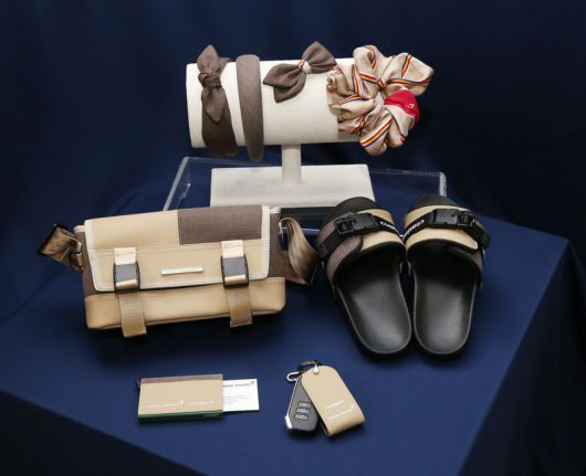 아시아나항공이 오는 9일부터 판매하는 업사이클링 신규 제품 4종(헤어 액세서리 4종, 가방, 신발, 카드지갑, 자동차 키케이스)의 모습.아시아나항공 제공 |