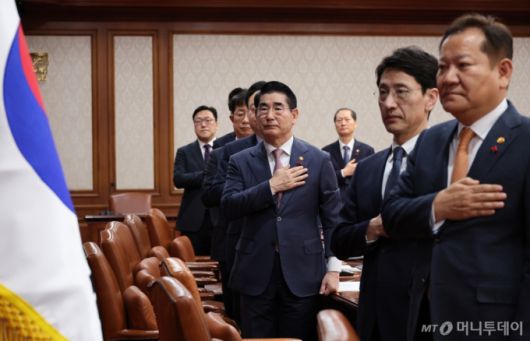 [서울=뉴시스] 김명원 기자 = 이상민 행정안전부 장관, 김용현 국방부 장관 및 국무위원들이 3일 오전 서울 종로구 정부서울청사에서 세종-서울 영상으로 열린 국무회의에 참석해 국민의례를 하고 있다. 2024.12.03. kmx1105@newsis.com /사진=김명원 |