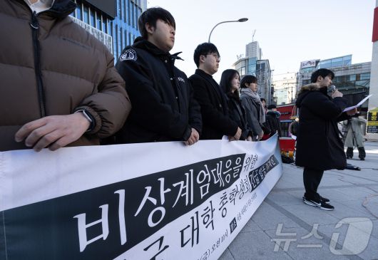 (서울=뉴스1) 이재명 기자 = 고려대학교·서강대학교를 비롯한 전국 7개 대학 총학생회 학생들이 6일 오전 서울 마포구 신촌 스타광장에서 비상계엄 대응을 위한 전국 대학 총학생회 긴급 합동 기자회견을 하고 있다. 2024.12.6/뉴스12expulsion@news1.krCopyright ⓒ 뉴스1. All rights reserved. 무단 전재 및 재배포, AI학습 이용 금지.