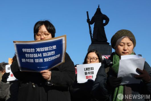[서울=뉴스핌] 양윤모 기자 = 한국여성단체연합이 6일 오전 서울 광화문광장 이순신 동상 앞에서 대한민국 헌정질서와 민주주의를 파괴한 내란죄 범죄자 윤석열을 파면하고, 그가 일으킨 내란죄에 대해 엄정한 처벌을 받을 것을 요구하는 '여성계 시국선언' 기자회견을 진행했다. 2024.12.06 yym58@newspim.com