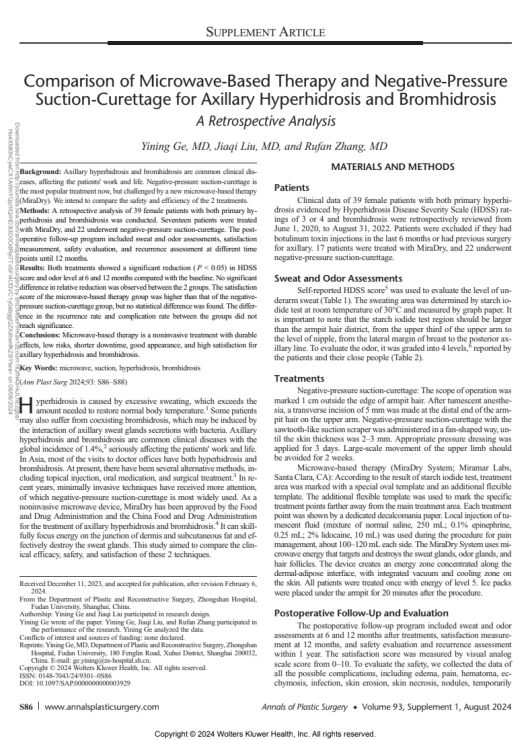 ‘Comparison of Microwave Based Therapy and Negative Pressure Suction-Curettage for Axillary Hyperhidrosis and Bromhidrosis 연구’는 중국 상해 푸단대학 종샨대학병원 성형외과에서 Yining Ge 교수팀이 진행했다.