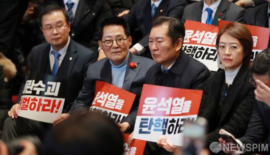 [서울=뉴스핌] 이형석 기자 = 윤석열 대통령이 국회를 방문할 것으로 알려진 6일 오후 야당 의원들이 로텐더홀에서 윤 대통령의 출입을 막기 위해 대기하고 있다. 2024.12.06 leehs@newspim.com