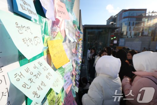 (서울=뉴스1) 신웅수 기자 = 이화여대 재학생들이 6일 오후 서울 서대문구 이화여대 앞에서 윤석열 대통령의 퇴진을 촉구하는 시국 선언을 한 후 대자보에 메시지를 붙이고 있다. 2024.12.6/뉴스1