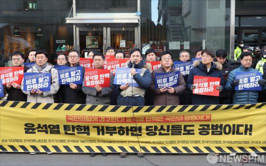 [서울=뉴스핌] 사진공동취재단 = 6일 오후 서울 여의도 국민의힘 중앙당사 앞에서 언론현업 11단체(방송기자연합회, 전국언론노동조합, 한국기자협회, 한국방송기술인연합회, 한국방송촬영인연합회, 한국사진기자협회, 한국아나운서연합회, 한국영상기자협회, 한국영상편집기자협회, 한국편집기자협회, 한국PD연합회) '윤석열 탄핵 거부하면 당신들도 내란 공범이다' 긴급 기자회견을 열고 있다. 2024.12.06 photo@newspim.com
