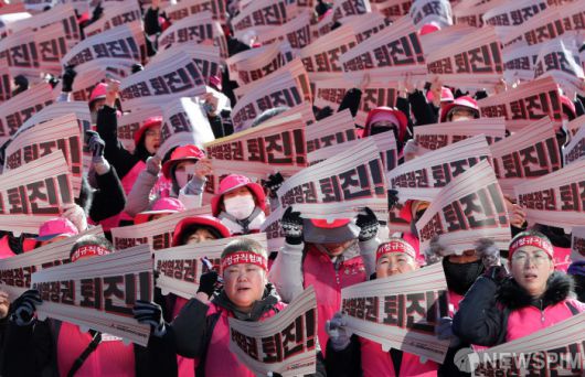 [서울=뉴스핌] 최지환 기자 = 6일 오후 서울 중구 동화면세점 앞에서 열린 전국학교비정규직 노동자 총파업 대회에서 노조원들이 구호를 외치고 있다. 2024.12.06 choipix16@newspim.com |