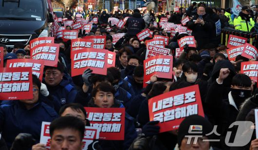 (서울=뉴스1) 이동해 기자 = 6일 서울 여의도 국회의사당 앞에서 열린 '내란범 윤석열 즉각 탄핵! 민심거역 국민의힘 규탄! 민주노총 결의대회'에서 참석자들이 손피켓을 들고 구호를 외치고 있다. 2024.12.6/뉴스1eastsea@news1.krCopyright ⓒ 뉴스1. All rights reserved. 무단 전재 및 재배포, AI학습 이용 금지.