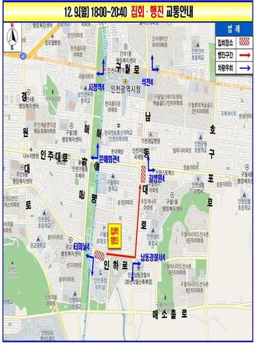 (인천=연합뉴스) 손현규 기자 = 인천경찰청은 오는 9일 저녁 시간에 남동구 일대에서 진행될 집회와 행진으로 교통혼잡이 예상된다고 6일 밝혔다.