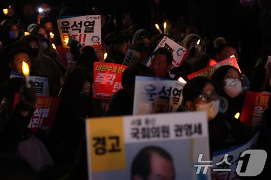 (서울=뉴스1) 이동해 기자 = 6일 오후 서울 여의도 국회의사당 앞에서 열린 윤석열 대통령의 퇴진 촉구 집회에서 시민들이 손피켓을 들고 정권 퇴진을 촉구하고 있다. 2024.12.6/뉴스1eastsea@news1.krCopyright ⓒ 뉴스1. All rights reserved. 무단 전재 및 재배포, AI학습 이용 금지.