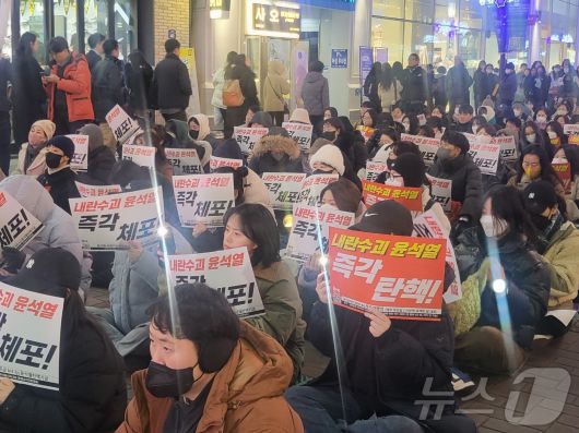 (대구=뉴스1) 이성덕 기자 = 6일 오후 대구 중구 동성로에서 열린 대구촛불행동에서 참석자들이 현 정권 탄핵을 촉구하고 있다. 2024.12.6/뉴스1