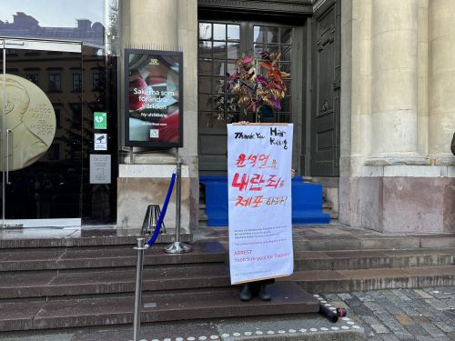 6일 스웨덴 스톡홀름 노벨 박물관 앞에서 윤석열 대통령 처벌을 요구하는 1인 시위가 열리고 있다. |