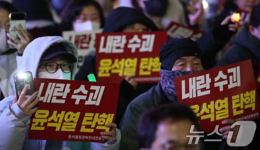 (대전=뉴스1) 김기태 기자 = 윤석열정권퇴진대전운동본부를 비롯해 시민사회단체 구성원들이 6일 저녁 대전 서구 은하수네거리 일대에서 윤석열 대통령의 퇴진을 촉구하고 있다. 2024.12.6/뉴스1presskt@news1.krCopyright ⓒ 뉴스1. All rights reserved. 무단 전재 및 재배포, AI학습 이용 금지.