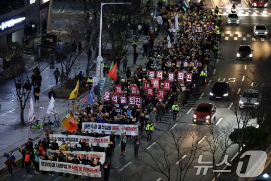 (대전=뉴스1) 김기태 기자 = 윤석열정권퇴진대전운동본부를 비롯해 시민사회단체 구성원들이 6일 저녁 대전 서구 은하수네거리 일대에서 윤석열 대통령의 퇴진을 촉구하며 행진을 하고 있다. 2024.12.6/뉴스1presskt@news1.krCopyright ⓒ 뉴스1. All rights reserved. 무단 전재 및 재배포, AI학습 이용 금지.
