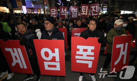 (대전=뉴스1) 김기태 기자 = 윤석열정권퇴진대전운동본부를 비롯해 시민사회단체 구성원들이 6일 저녁 대전 서구 은하수네거리 일대에서 윤석열 대통령의 퇴진을 촉구하며 행진을 하고 있다. 2024.12.6/뉴스1