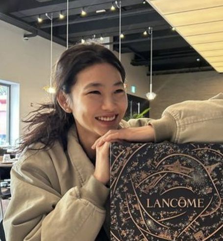 공개된 사진 속 정호연은 한 브랜드로부터 선물을 받고 행복한 미소를 짓고 있는 모습.