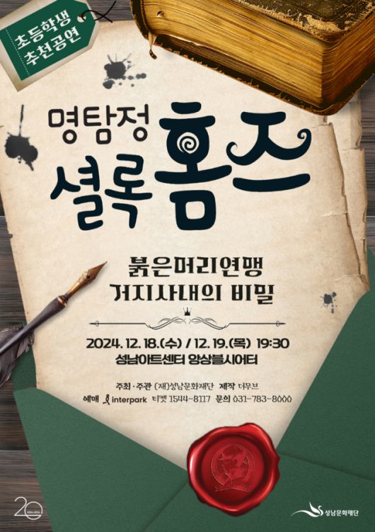 연말을 맞아 가족 뮤지컬 ‘명탐정 셜록홈즈 : 붉은 머리 연맹, 거지 사내의 비밀’이 18일과 19일 앙상블시어터에서 선보인다. 명탐정 셜록홈즈는 전 세계 수많은 문학작품 가운데 가장 유명한 캐릭터인 셜록홈즈를 온 가족이 함께 볼 수 있는 창작 뮤지컬로 구성한 작품이다. 상상력과 관찰력, 사고력, 판단력을 자극하는 미스터리한 추리극으로, 초등학생부터 어른들까지 세대를 불문하고 흥미롭게 관람할 수 있는 공연이다. 이번 공연에서는 셜록홈즈 시리즈 중 가장 독특한 ‘붉은 머리 연맹’ 편과 기발한 반전과 긴장감 넘치는 전개가 돋보이는 걸작 ‘거지 사내의 비밀’ 편을 한 무대에서 만나볼 수 있다. 티켓은 전석 1만 원이다.