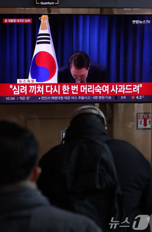 (서울=뉴스1) 신웅수 기자 = 윤석열 대통령에 대한 국회 탄핵안 표결일인 7일 오전 서울역 대합실에서 시민들이 윤 대통령의 대국민 비상계엄 관련 담화를 시청하고 있다. 2024.12.7/뉴스1phonalist@news1.krCopyright ⓒ 뉴스1. All rights reserved. 무단 전재 및 재배포, AI학습 이용 금지.